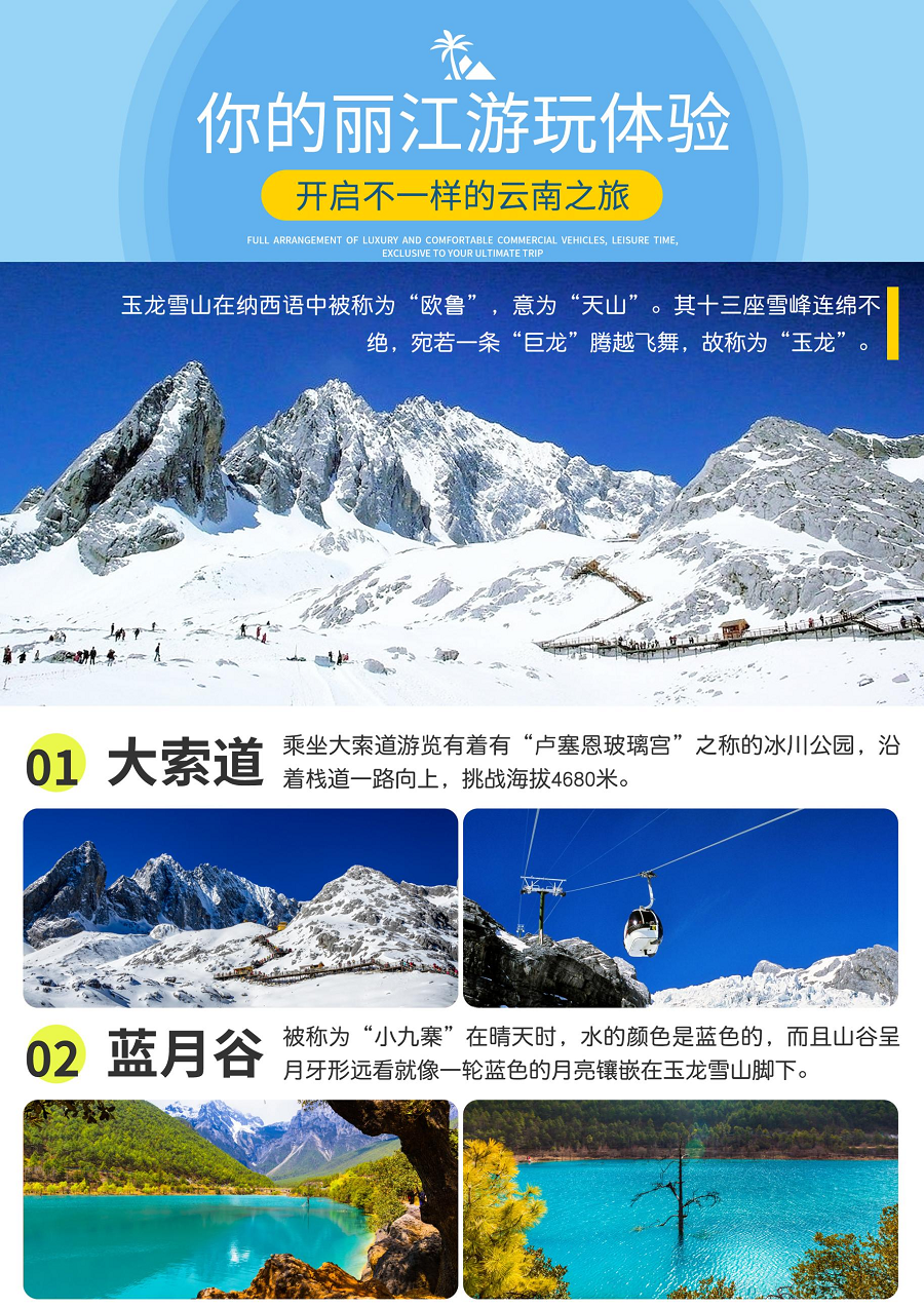 | 门票及地面项目 | 行程中所列景点/场馆首道大门票玉龙雪山→蓝月谷→丽江古城——冰川公园大索道 | 行程中所列景点/场馆首道大门票玉龙雪山→蓝月谷→丽江古城——冰川公园大索道 |