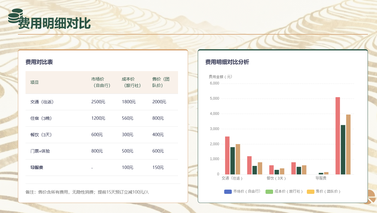 ◦ 线路定价透明,包含/不含费用需清晰罗列,无隐性消费。